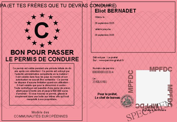 Envoyez par email le Bon pour passer le permis de conduire personalisé