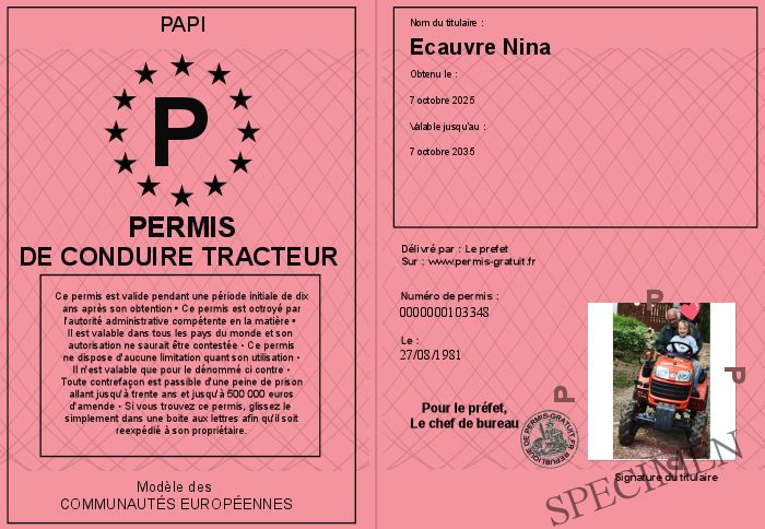 Envoyez par email le Permis de conduire tracteur personalisé par la PAPI ! Personnaliser mon permis