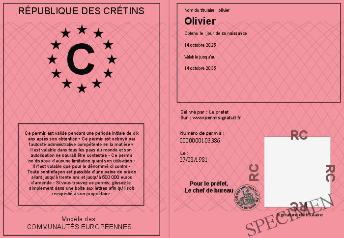 Envoyez par email le personalisé par la République Des Crétins ! Personnaliser mon permis