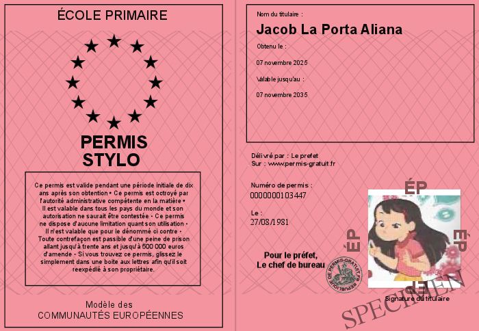 Envoyez par email le Permis stylo personalisé par la école primaire ! Personnaliser mon permis