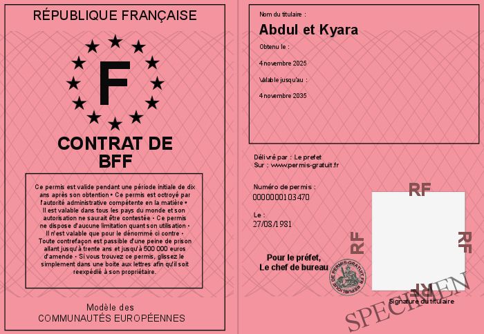 Envoyez par email le Contrat de BFF personalisé par la République Française ! Personnaliser mon permis