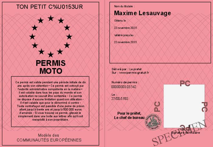 Envoyez par email le Permis moto personalisé par la Ton petit coeur ! Personnaliser mon permis