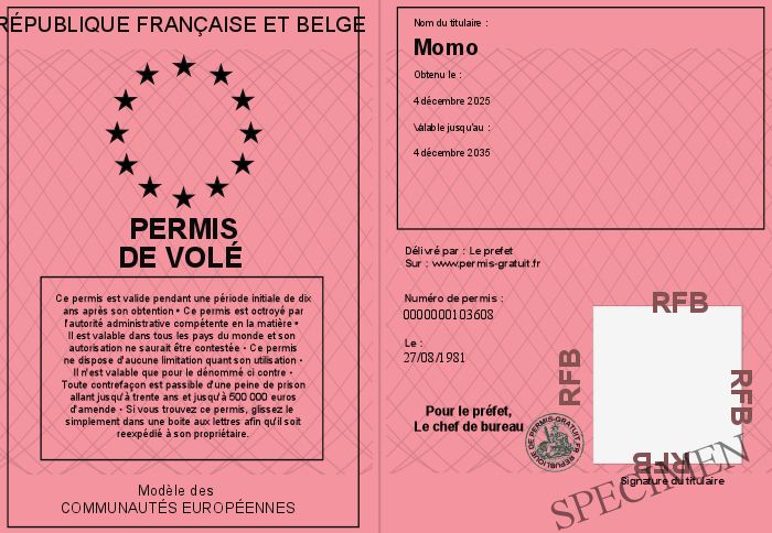 Envoyez par email le Permis de volé personalisé
