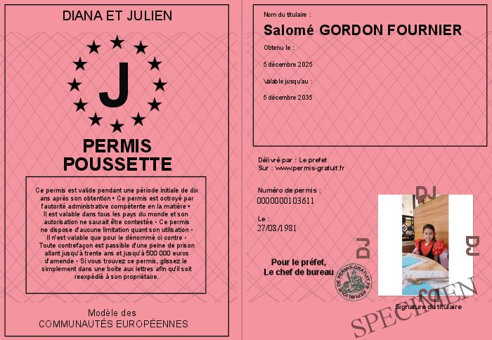 Envoyez par email le Permis poussette personalisé par la Diana et Julien ! Personnaliser mon permis