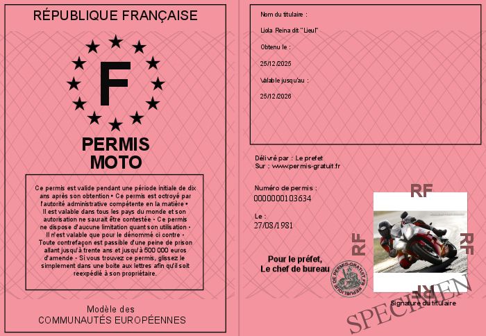 Envoyez par email le Permis MOTO personalisé par la République Française ! Personnaliser mon permis
