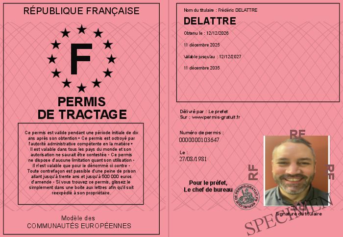 Envoyez par email le PERMIS DE TRACTAGE personalisé