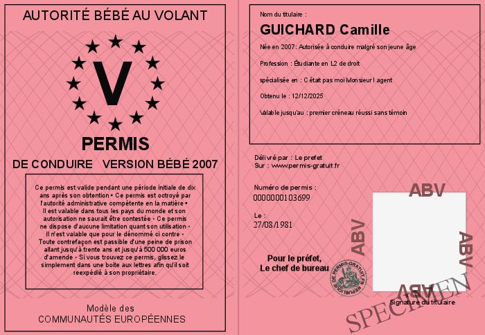 Envoyez par email le Permis de conduire Version Bébé 2007 personalisé