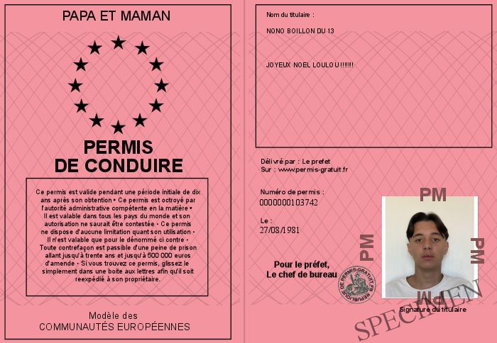 Envoyez par email le Permis de conduire personalisé par la PAPA et MAMAN ! Personnaliser mon permis