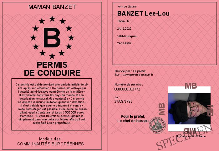 Envoyez par email le Permis de conduire personalisé par la Maman Banzet ! Personnaliser mon permis