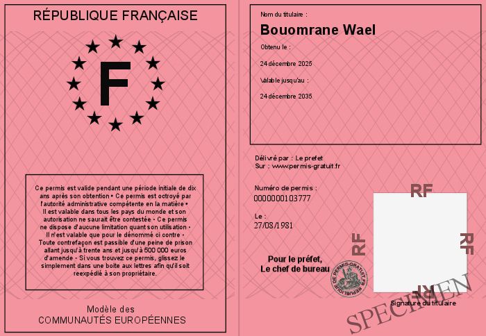 Envoyez par email le personalisé par la République Française ! Personnaliser mon permis