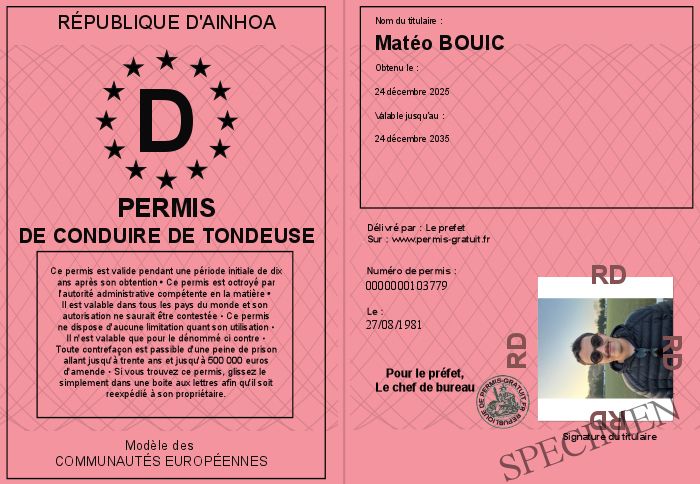 Envoyez par email le Permis de conduire de tondeuse personalisé