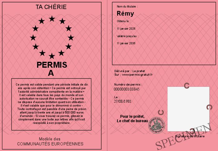 Envoyez par email le Permis A personalisé par la Ta chérie ! Personnaliser mon permis