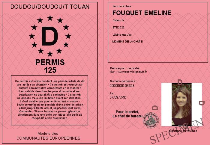 Envoyez par email le Permis 125 personalisé par la DOUDOU/DOUDOU/TITOUAN ! Personnaliser mon permis