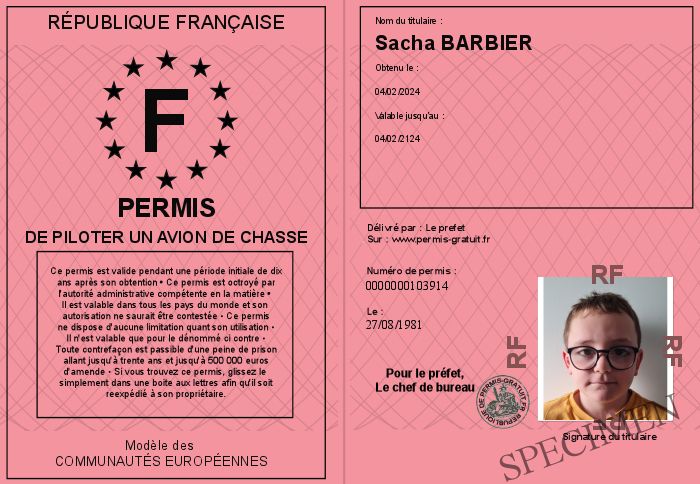 Envoyez par email le Permis de piloter un avion de chasse personalisé