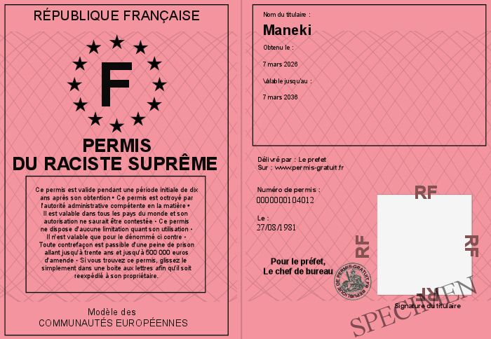 Envoyez par email le Permis du raciste suprême personalisé