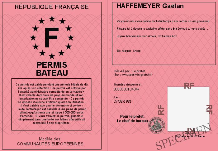 Envoyez par email le Permis Bateau personalisé par la République Française ! Personnaliser mon permis