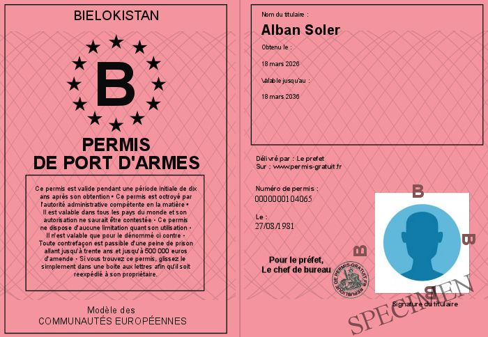 Envoyez par email le Permis de port d'armes personalisé par la Bielokistan ! Personnaliser mon permis