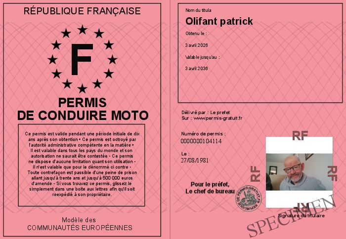 Envoyez par email le Permis de conduire moto personalisé