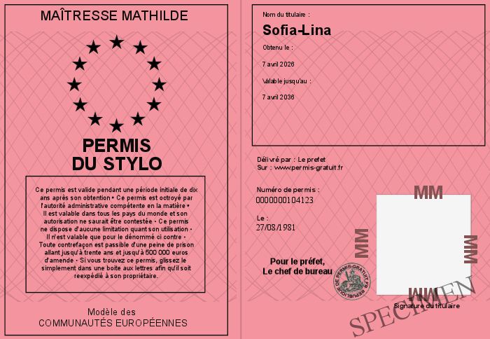 Envoyez par email le Permis du stylo personalisé par la Maîtresse Mathilde ! Personnaliser mon permis