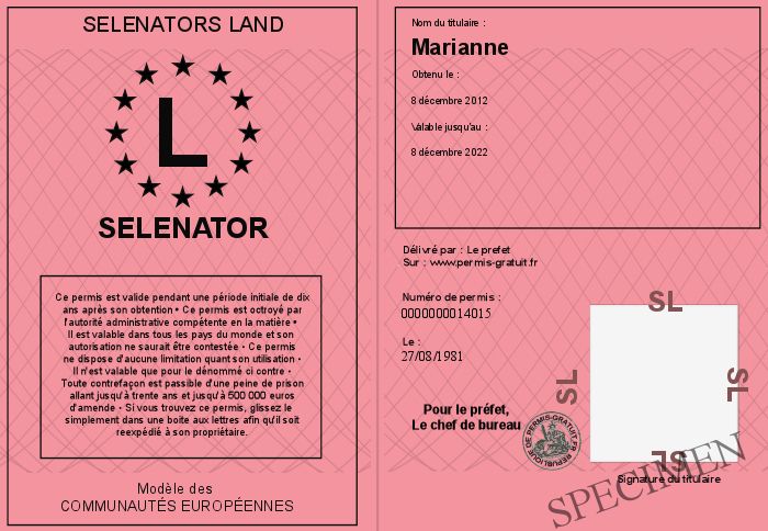 Envoyez par email le SELENATOR personalisé par la Selenators Land ! Personnaliser mon permis