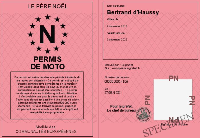 Envoyez par email le Permis de moto personalisé par la le Père Noël ! Personnaliser mon permis
