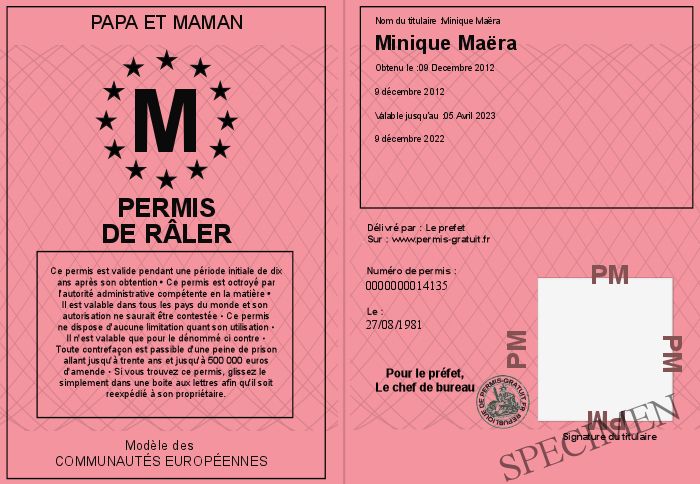 Envoyez par email le Permis de râler personalisé par la Papa et Maman ! Personnaliser mon permis