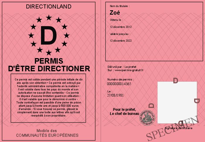 Envoyez par email le Permis d'être directioner personalisé