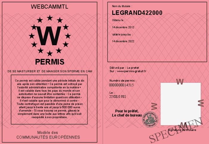 Envoyez par email le Permis de se MASTURBER et de MANGER son SPERME en CAM personalisé