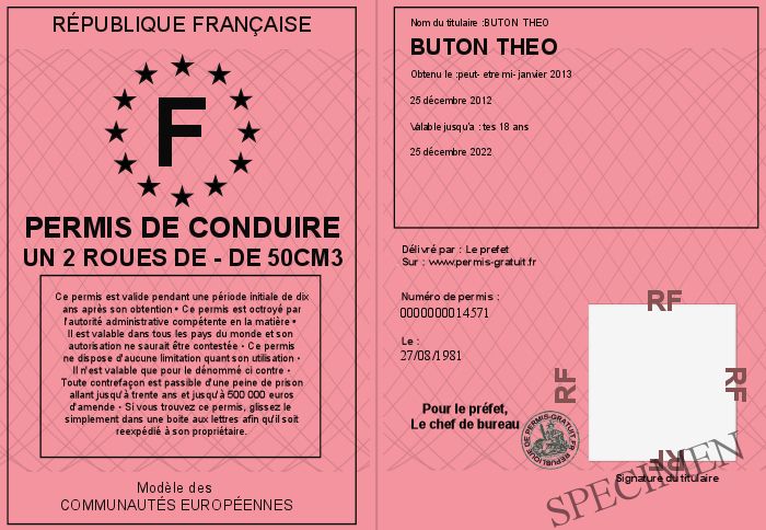 Envoyez par email le Permis de conduire un 2 roues de - de 50cm3 personalisé