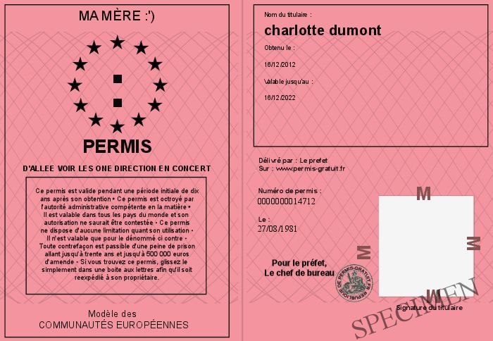 Envoyez par email le PERMIS D'ALLEE VOIR LES ONE DIRECTION EN CONCERT personalisé