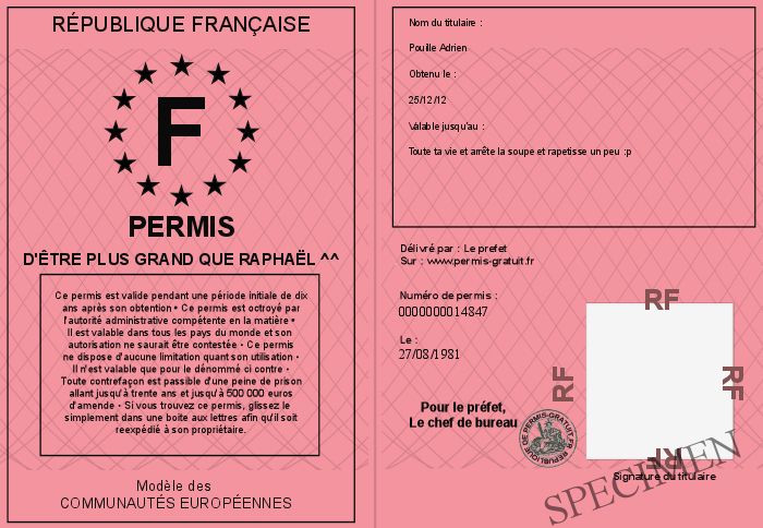 Envoyez par email le Permis d'être plus grand que Raphaël ^^ personalisé