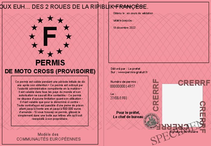 Envoyez par email le Permis de moto cross (provisoire) personalisé