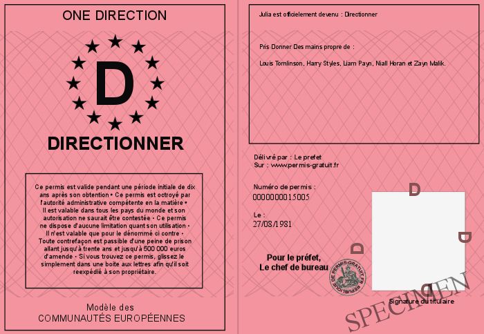 Envoyez par email le Directionner personalisé par la One Direction ! Personnaliser mon permis