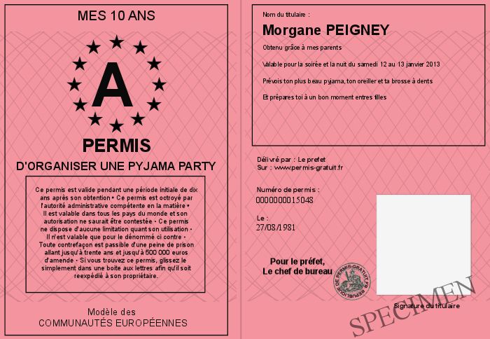 Envoyez par email le Permis d'organiser une pyjama party personalisé