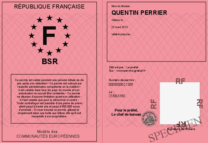 Envoyez par email le BSR personalisé par la République Française ! Personnaliser mon permis