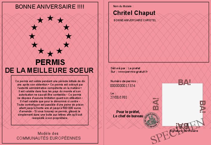 Envoyez par email le Permis de la Meilleure Soeur personalisé