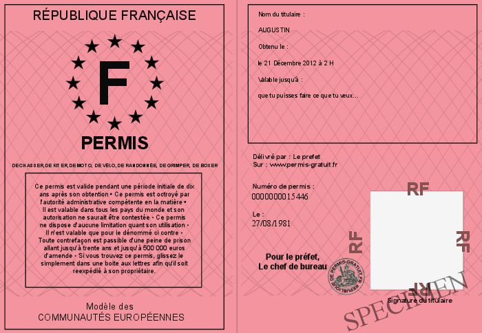 Envoyez par email le Permis de Chasser,de Kiter,de moto, de vélo,de randonnée, de grimper, de Boxer personalisé