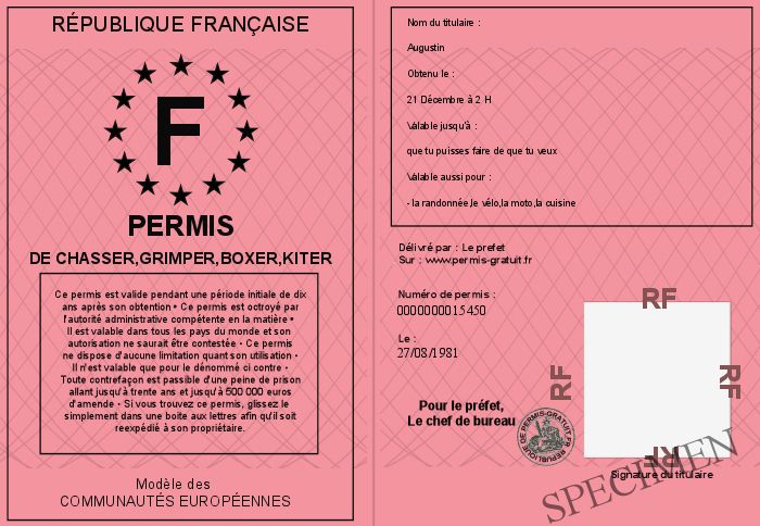 Envoyez par email le Permis de Chasser,Grimper,Boxer,Kiter personalisé