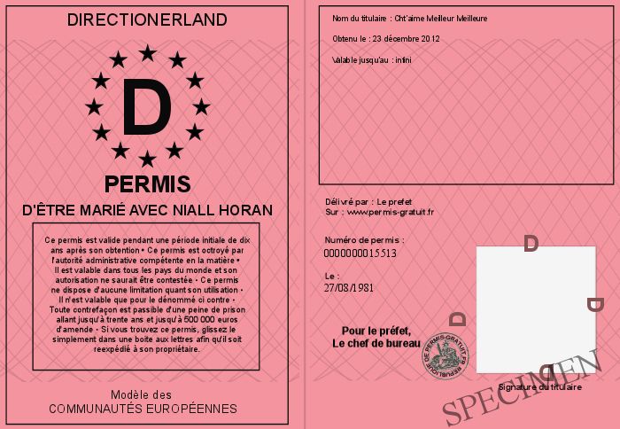 Envoyez par email le permis d'être marié avec Niall Horan personalisé