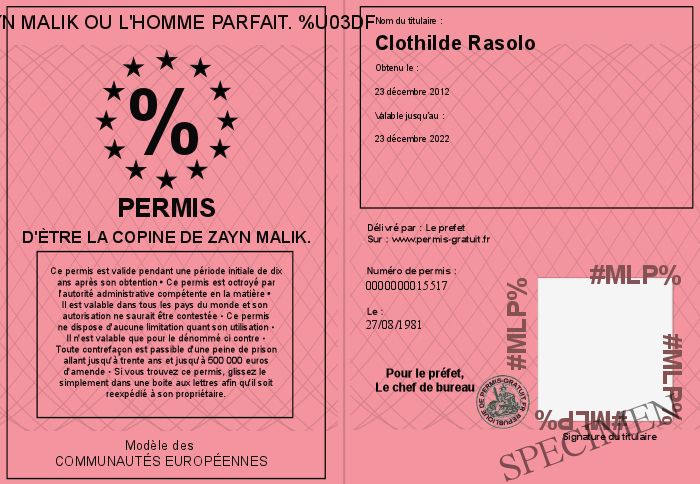 Envoyez par email le Permis d'ètre la copine de Zayn Malik. personalisé