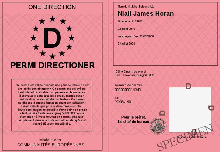 Envoyez par email le Permi Directioner personalisé par la One Direction ! Personnaliser mon permis