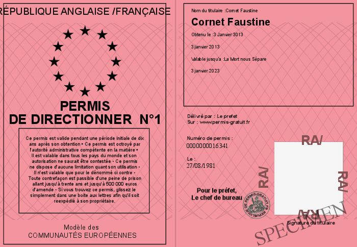 Envoyez par email le Permis de Directionner n°1 personalisé