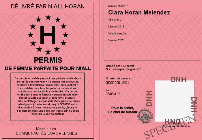 Envoyez par email le Permis de Femme Parfaite pour Niall personalisé