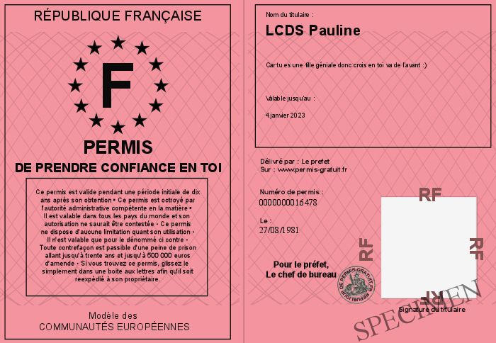 Envoyez par email le Permis de Prendre Confiance en toi personalisé