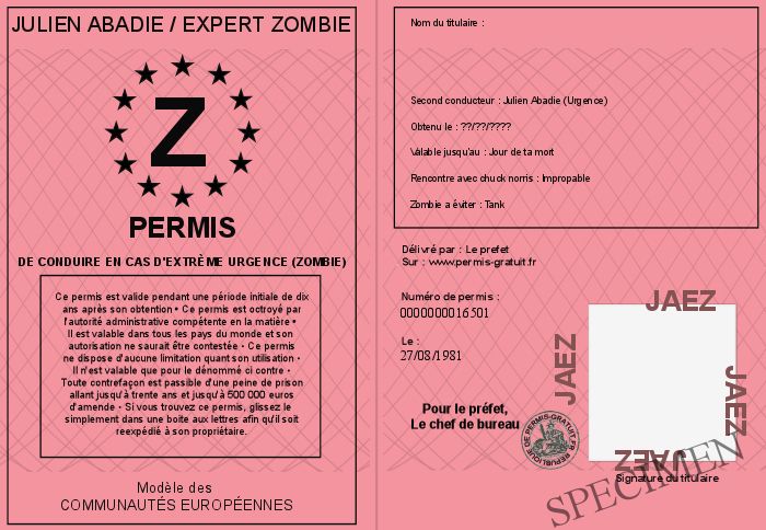Envoyez par email le Permis de conduire en cas d'extrème urgence (Zombie) personalisé