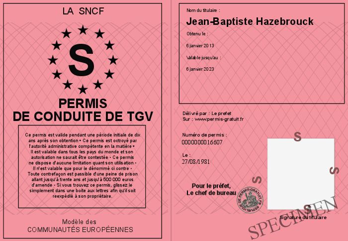 Envoyez par email le Permis de conduite de TGV personalisé par la la SNCF ! Personnaliser mon permis