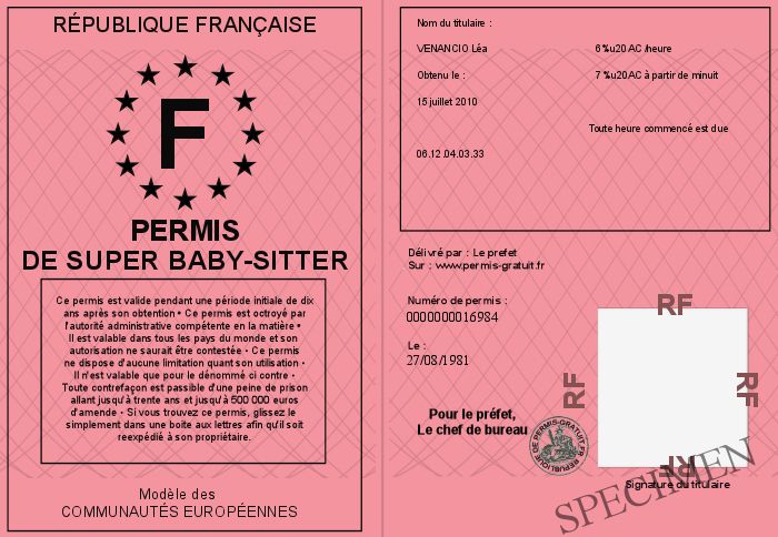 Envoyez par email le Permis de super Baby-sitter personalisé
