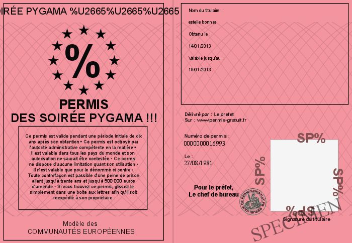 Envoyez par email le Permis des soirée pygama !!! personalisé