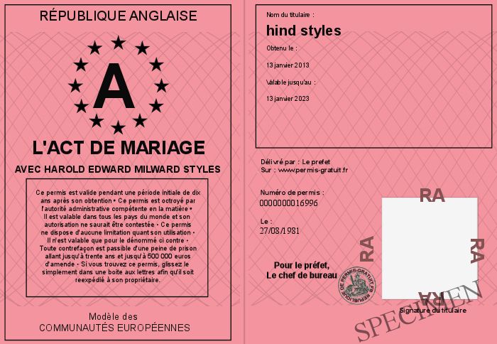Envoyez par email le l'act de mariage avec harold edward milward styles personalisé
