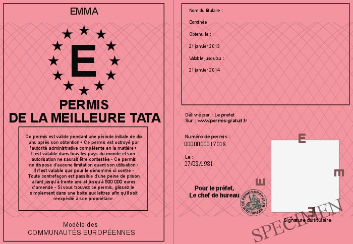 Envoyez par email le Permis de la meilleure tata personalisé par la Emma ! Personnaliser mon permis